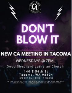 New Meeting: Don’t Blow It Posted on May 2, 2025Updated on May 2, 2025by wscaadminCategories:Meetings New Meeting: Don’t Blow It Wednesdays @ 7pm Good Shepard Lutheran Church140 E 56th St, Tacoma, WA 98404